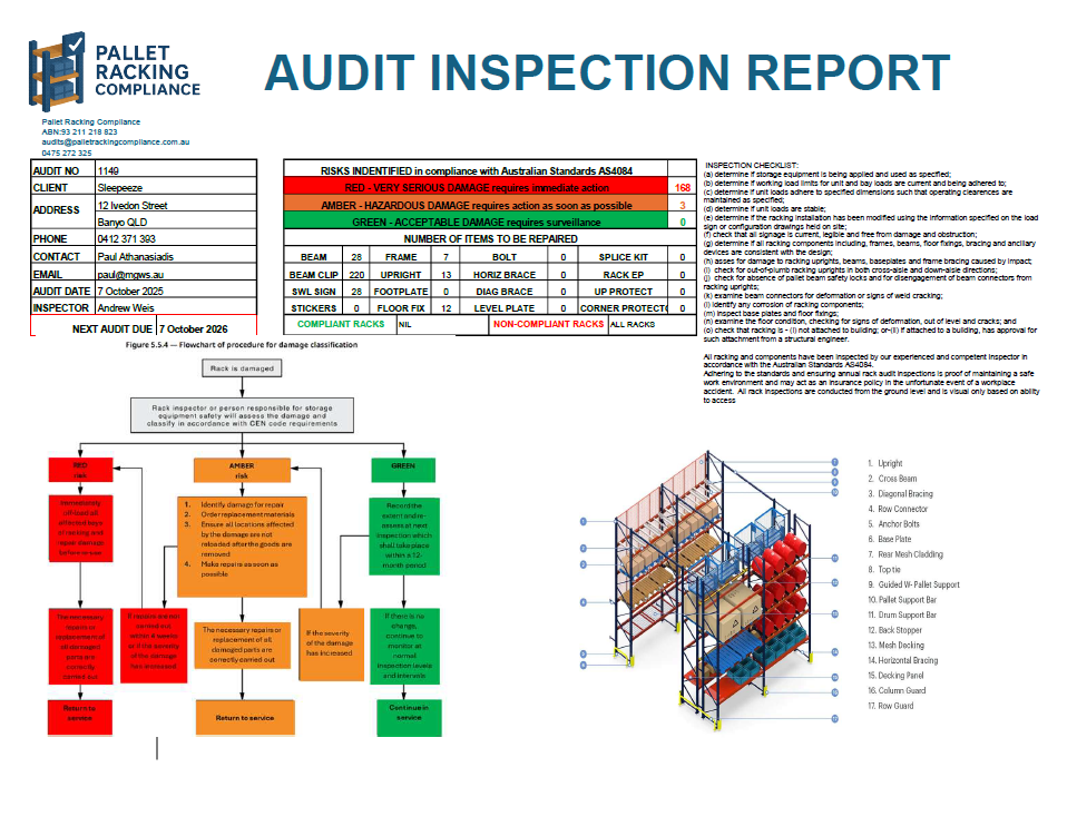 Comprehensive pallet racking evaluation based on Australian Standard.